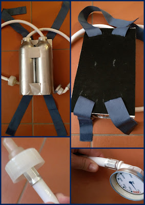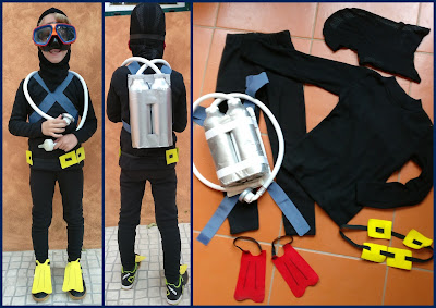 Máscara também muito simples, que só vale pelos pormenores: camisola e leggings pretas, passa-montanhas também preto (Decathlon), óculos de mergulho. Sem maquilhagem, bom para aqueles miúdos que não gostam de pinturas (não é o caso de nenhum dos meus). Cinto de pesos feito com elástico e musgumi. Barbatanas ilusórias com elástico e musgumi primeiro, antes de se romper todo, e com feltro depois (muito melhor solução, aconselho). O desafio maior foram as botijas: duas garrafas de leite interligadas com fita adesiva, pintadas com tinta de spray cinzenta metalizada; um tubo de canalização com entrada e saída diferentes (comprado numa loja de chinês), a entrar e a sair pelas garrafas (que são de um material muito fácil de trabalhar), e cujas pontas foram aproveitadas, uma para colar uma tampa de frasco com uma impressão de medidor de oxigénio, outra para colar uma tetina descartável de biberon (que não resultou, descolou e ficou sem nada); tudo colado numa placa de cartão com duas tiras de tecido (que vinham a prender uma manta comprada no Natal) com velcro.