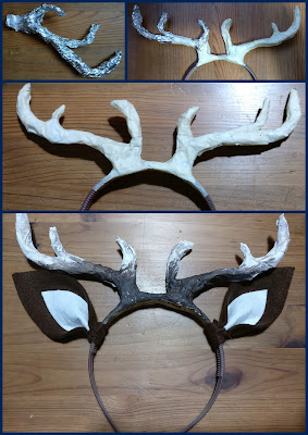 Máscara muito simples: camisola e leggigns castanhas, com acrescentos de barriga, bolinhas nas costas e rabinho. Maquilhagem a preceito. E, como pormenor, o desafio mais interessante da fantasia: as hastes. Muito mais simples do que parece... papel de alumínio (muito leve e moldável) a fazer o formato pretendido, revestido com fita adesiva de proteção de pintura, pinta-se e acrescenta-se umas orelhinhas de feltro. Segui dicas de vários blogs e o efeito resultante foi espetacular.