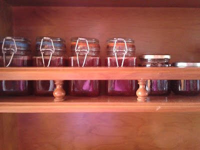 Dois frascos pequenos de um doce espesso e escuro e quatro frascos de 250 ml de doce mais fluído e de  uma cor mais de acordo com a fruta que lhe deu origem.